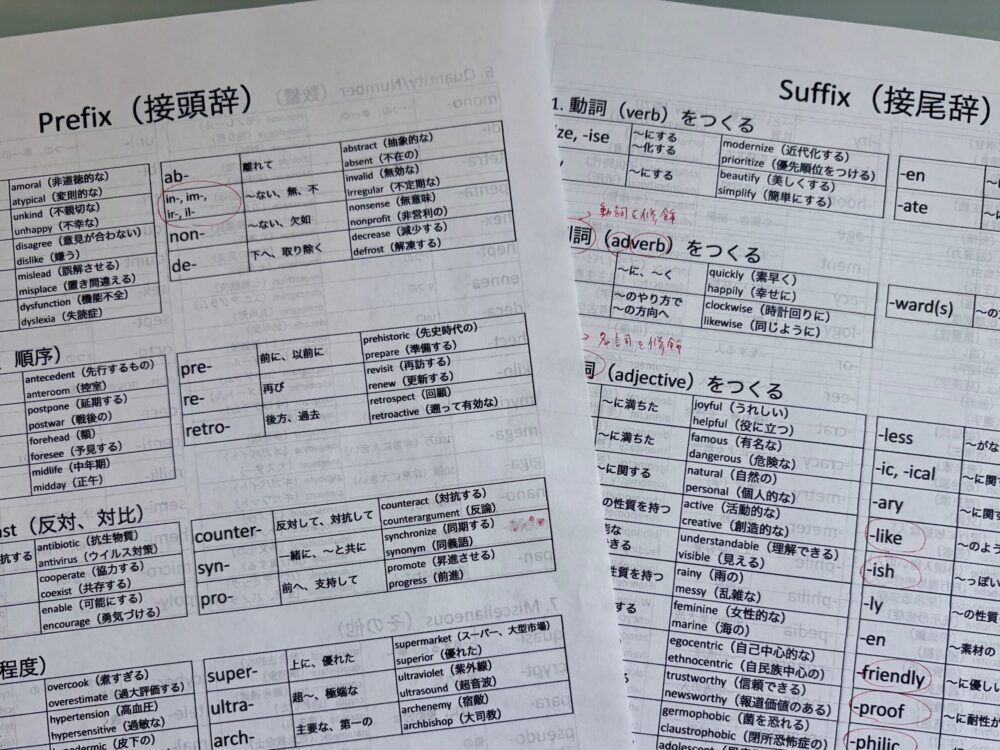 ・in-(否定)、dis-(反対)、con-(一緒に)、trans-(横切る)、poly-(たくさん)、hemi-(半分)などの接頭辞は、単語学習の必須知識